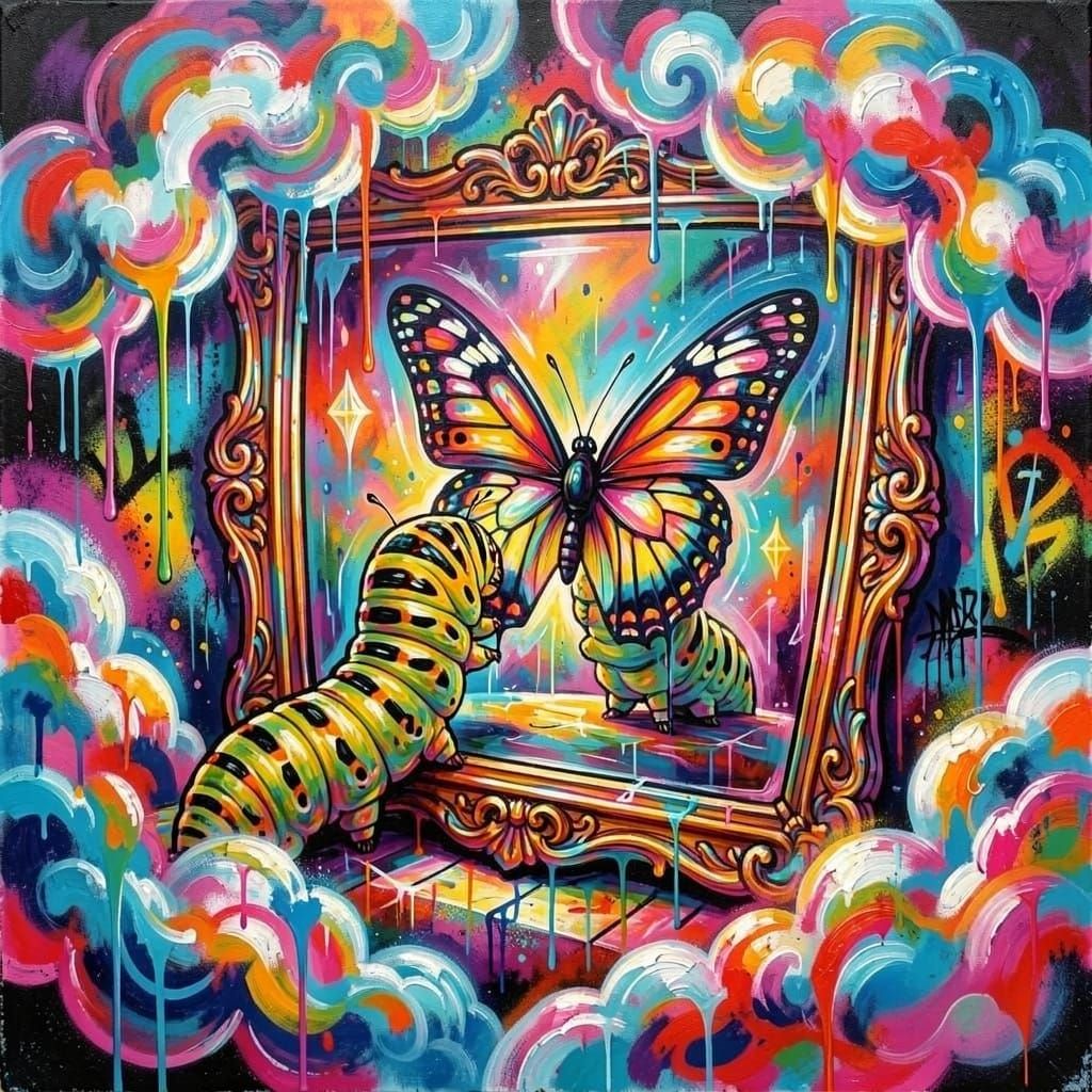 This image shows a caterpillar seeing its future butterfly form in a mirror, surrounded by crystal dream clouds. Rendered in a vibrant graffiti art style with high contrast and ultra-detailed quality.