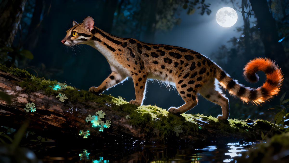 This image shows a banded linsang, a long creature with tan fur, black spots, and a ringed tail, walking on a mossy log in the dark. The animal has a pointed nose, large eyes, and touches of orange on its tail and paws.