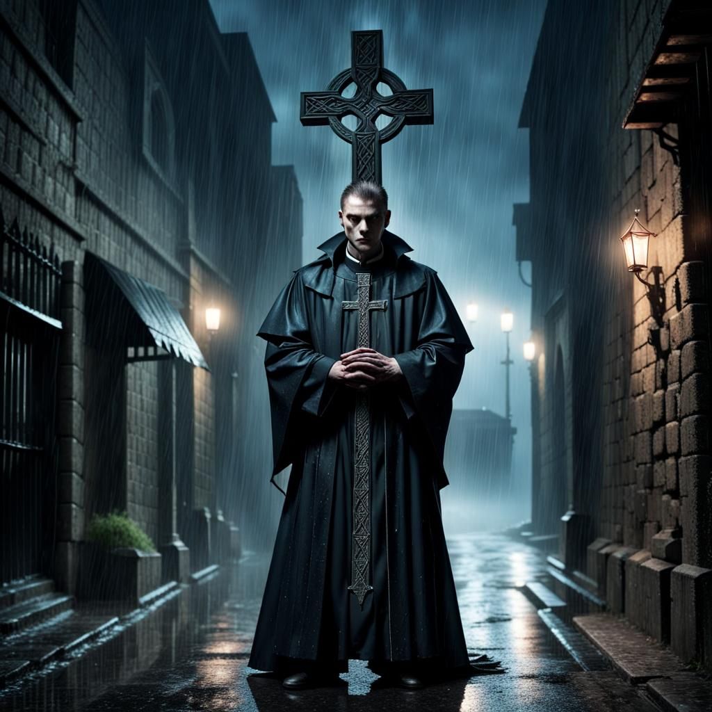 This image shows a priest in a dark alley, battling vampires. He wears a soutane with a Celtic cross and stands in the rain, embodying a gothic horror aesthetic.