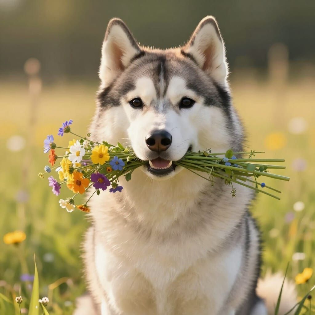 This digital painting captures a sweet husky with dark eyes, holding wildflowers in a meadow bathed in golden hour light. Features soft textures and a warm palette.