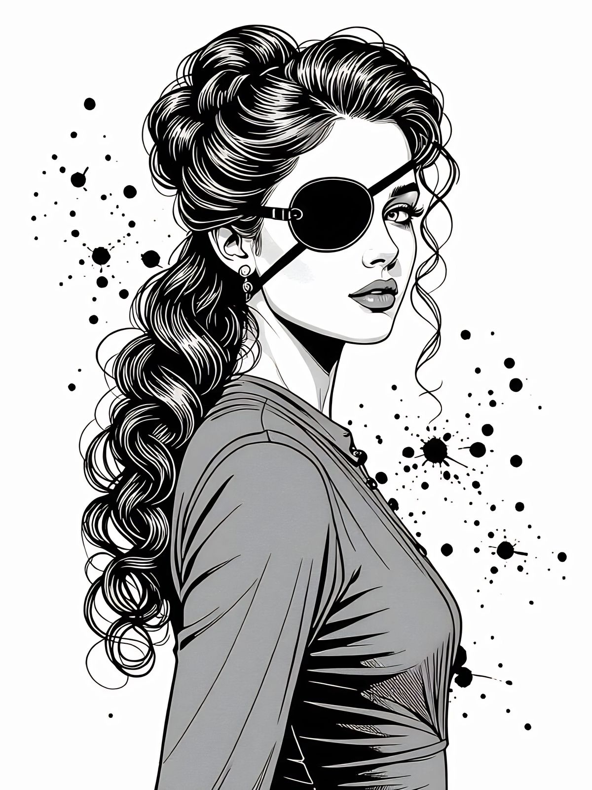 A striking black and white portrait of a young Victorian woman with curly hair and an eyepatch. The image features a dynamic, minimalist composition with ink splatters, evoking a retro-futuristic aesthetic.