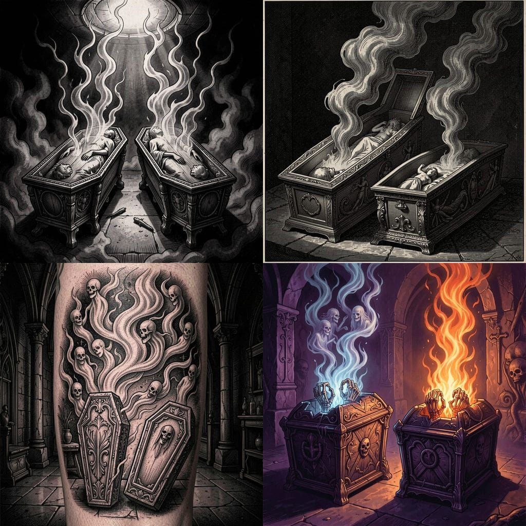 This image shows two coffins with souls depicted as a smoky stream emerging from them, created as a drawing for tattoo reference.