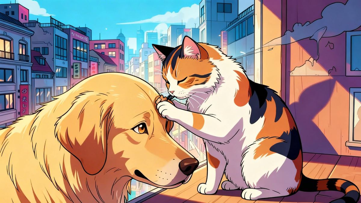 This image shows a fluffy calico cat grooming a golden retriever's ear, created in a vibrant, flat anime style with cel-shaded textures and crisp linework. Cinematic lighting enhances the scene.
