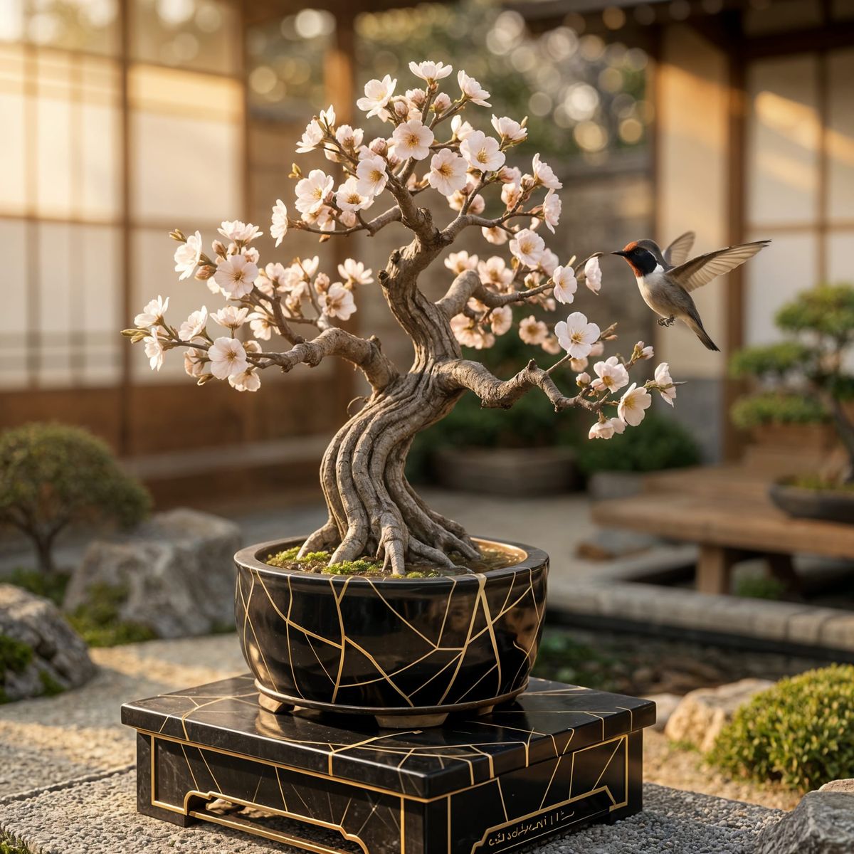 This image shows a detailed, realistic close-up of a hummingbird near a small bonsai tree in a black Kintsugi-style ceramic pot, set against a complex Japanese garden backdrop.