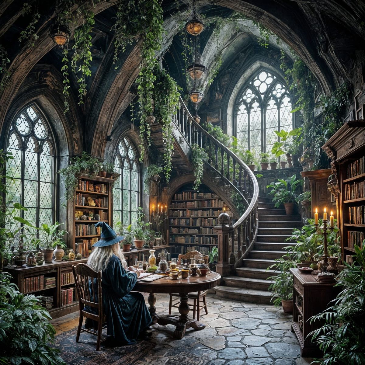 A hyperdetailed, cinematic image of a wizard's cozy underground cavern filled with magical plants, potions, and intricate details. Lush scenery outside crystal windows.