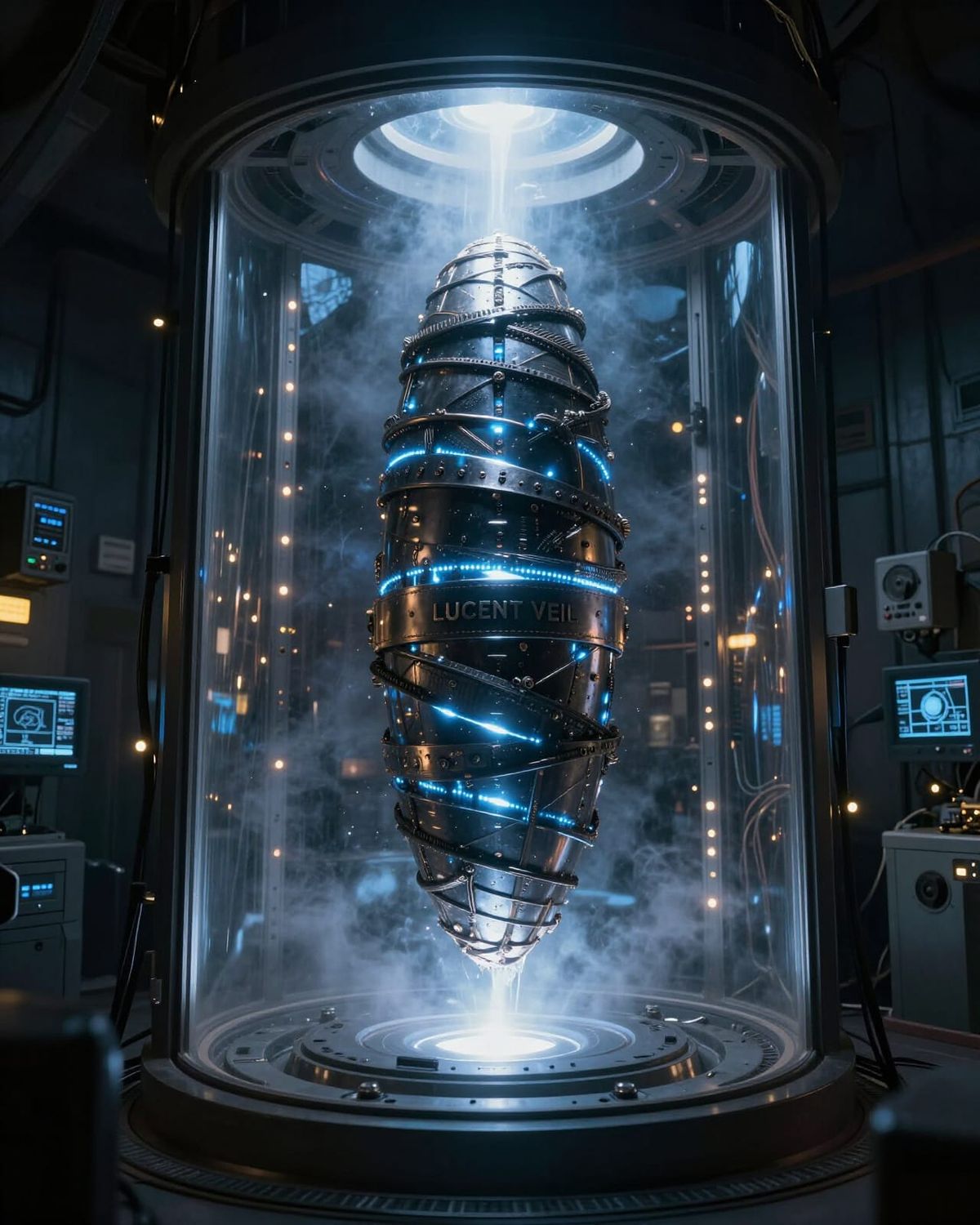This image shows a sealed relic wrapped in metallic bands, floating in a cylindrical vault. It emits bright blue-white light, illuminating a classified research environment with advanced technology.