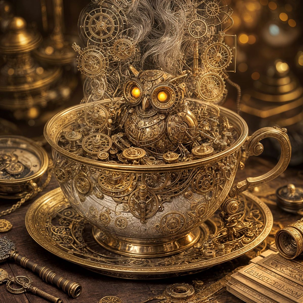 This highly detailed steampunk image showcases an antique teacup overflowing with intricate clockwork mechanisms. A small mechanical owl with glowing amber eyes rests within, while steam subtly forms schematic diagrams.