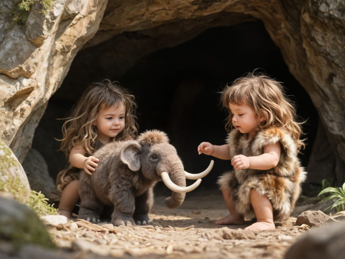 This realistic image shows adorable prehistoric toddlers in fur clothes playing with a baby woolly mammoth outside a cave, bathed in natural light.