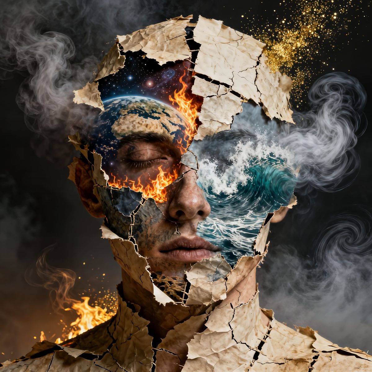A hyper-realistic double exposure image. A face emerges from peeling, ancient paper layers revealing earth, fire, water, and air elements. Features include cosmic earth, flames, waves, and winds against a shadowed, atmospheric void.