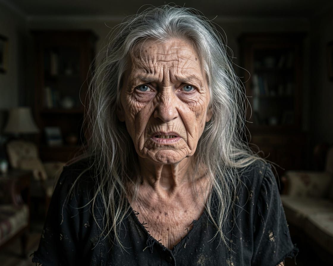 This striking image features a photorealistic close-up of an elderly, wizened woman with a deeply wrinkled face and wild gray hair. She wears a dark, frayed dress and stares angrily at the viewer. Cinematic lighting enhances the detail.