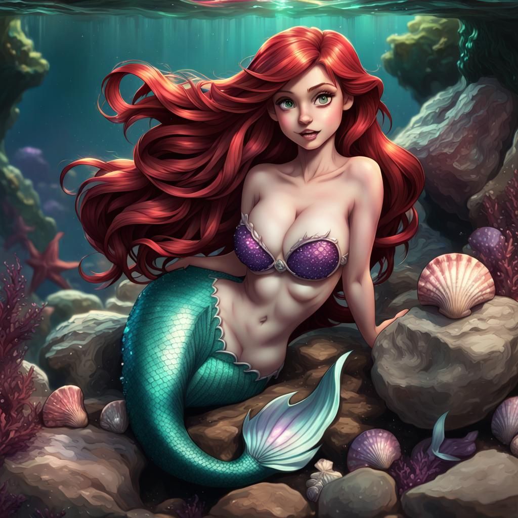 This image depicts a chibi-style Little Mermaid, Ariel, with crimson hair, seashell bra, and green sparkly tail. She is sitting on a rock underwater in a detailed digital art style.