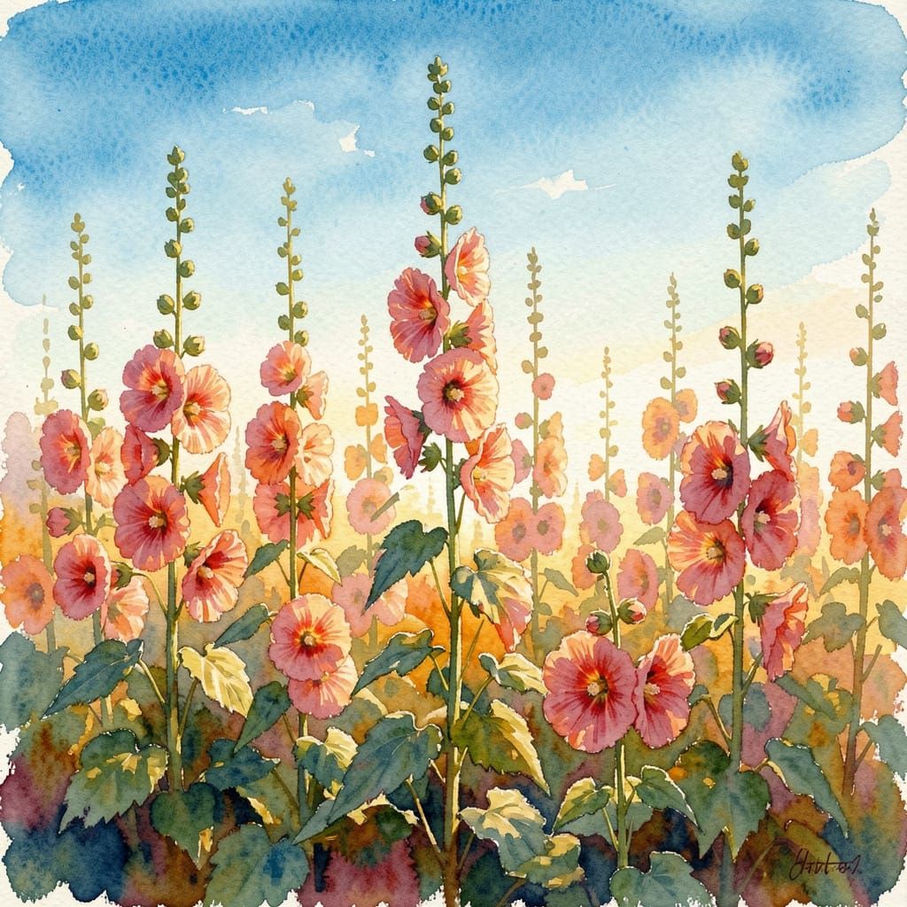 This image displays a field of vivid hollyhock flowers bathed in warm golden hour light. The artwork is rendered in a loose, expressive watercolor style with visible brushstrokes and bleeding colors.
