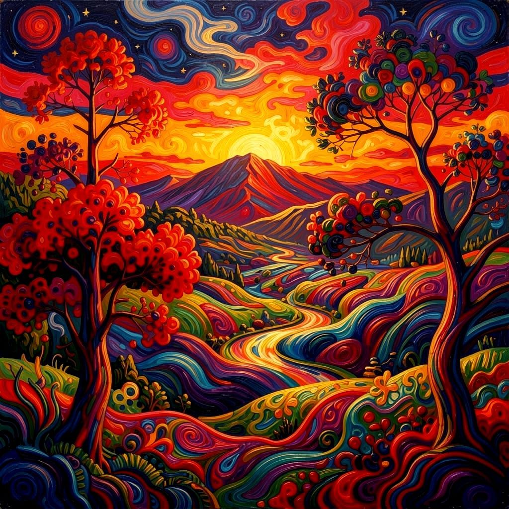 This oil painting depicts a vibrant, wide-angle psychedelic landscape at sunset. The sky and rolling hills feature swirling patterns and bold colors, with stylized trees in the foreground.