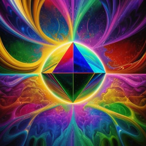 A striking picture of light refracting through a prism, creating a rainbow of colors and shimmering geometric patterns. The artwork is rendered as a vibrant, surreal macro photograph with an abstract expressionist aesthetic.