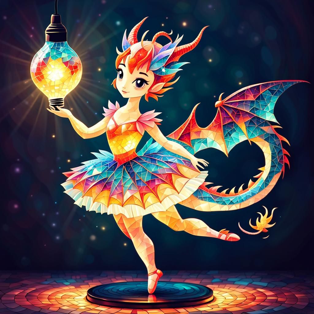 This image depicts a cute, magical dragon ballerina dancing inside a glowing light bulb. The artwork features a mosaic effect and complementary colors, rendered with fine details in an abstract style.
