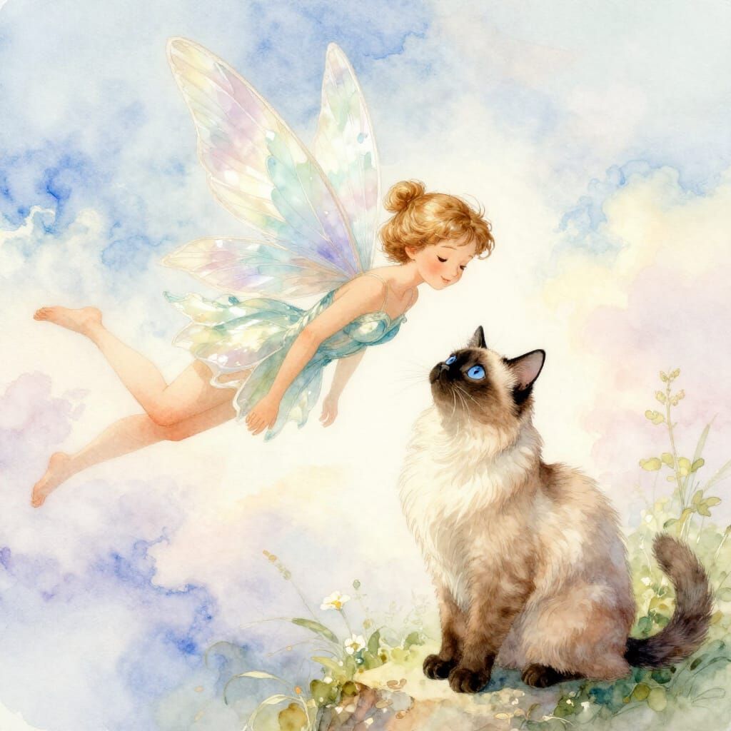 This image shows a lovely fairy with iridescent wings flying beside a serene Birman cat with blue eyes. It's a dreamy watercolor painting with soft colors and delicate lines, evoking a magical atmosphere.