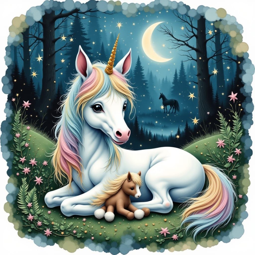 This ethereal watercolor painting shows a magical unicorn foal with a sparkling white coat and pastel mane resting on ferns. Moonlight illuminates her as her parents graze in the bokeh background.