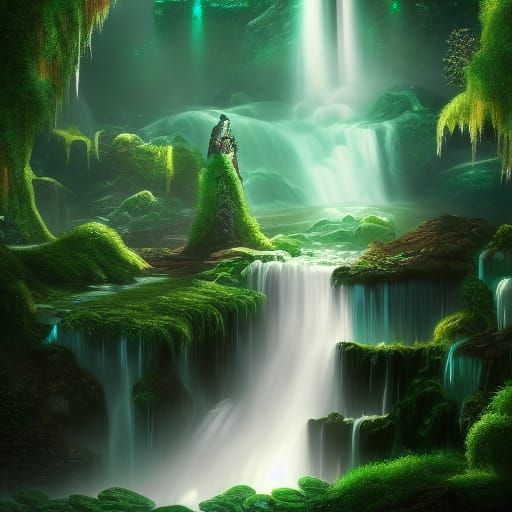 This image shows a stunning emerald green waterfall cascading down rocks. The digital painting features deep, complementary colors and intricate details, reminiscent of fantasy concept art in 8k resolution.