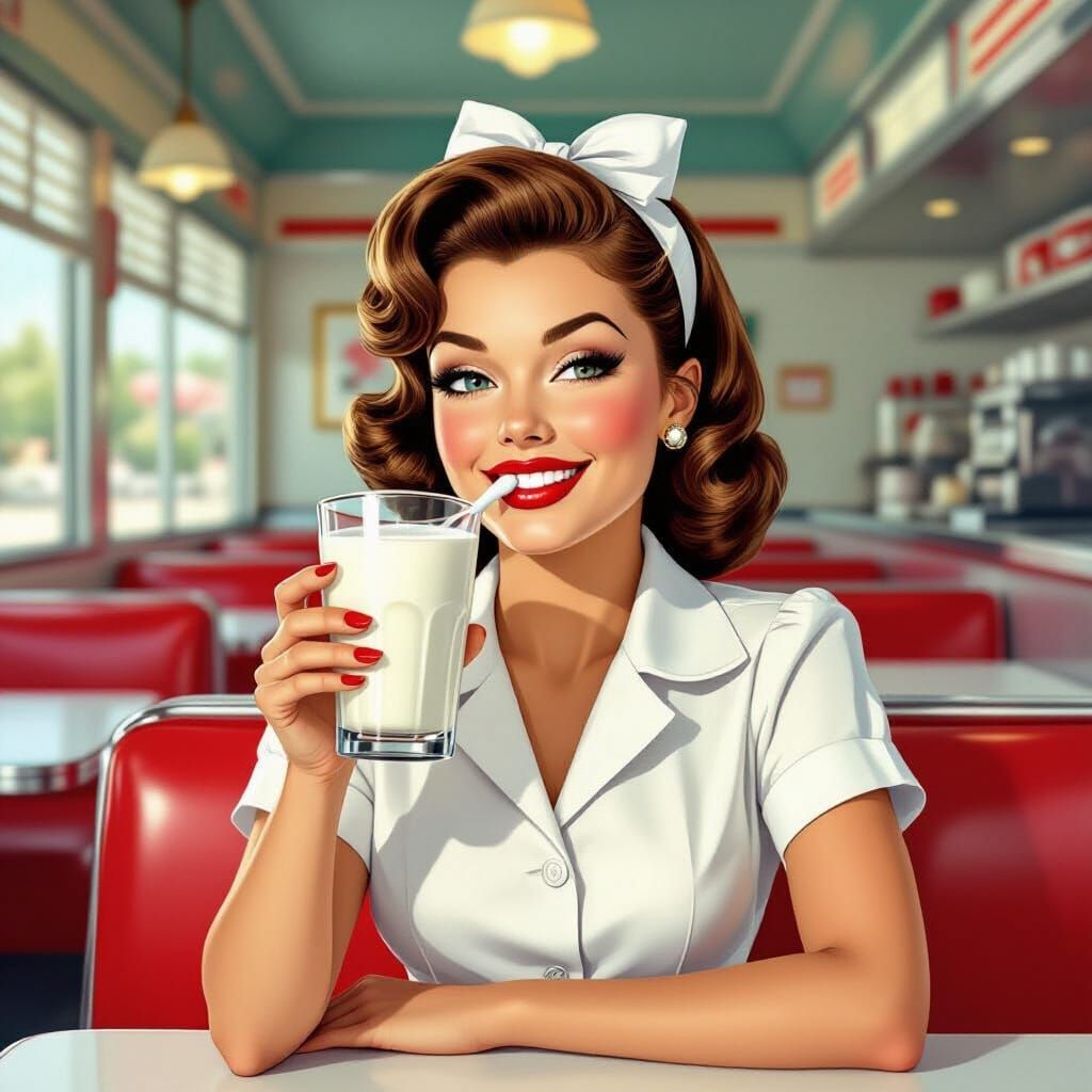 A realistic illustration of a 1950s diner scene featuring a waitress with a milk mustache. The artwork uses bold outlines and a playful, retro aesthetic.