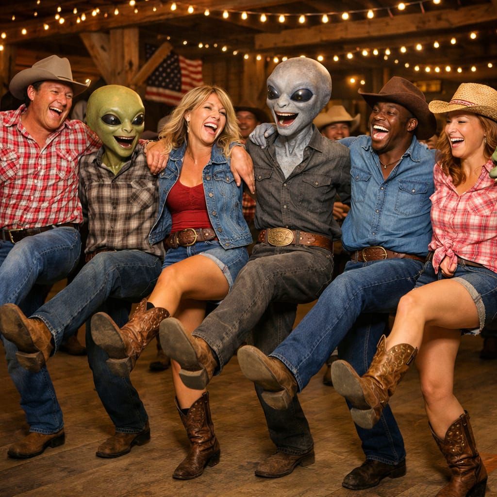 This image depicts a joyful scene of aliens and people engaged in line dancing. It captures a moment of shared fun and connection between different beings.