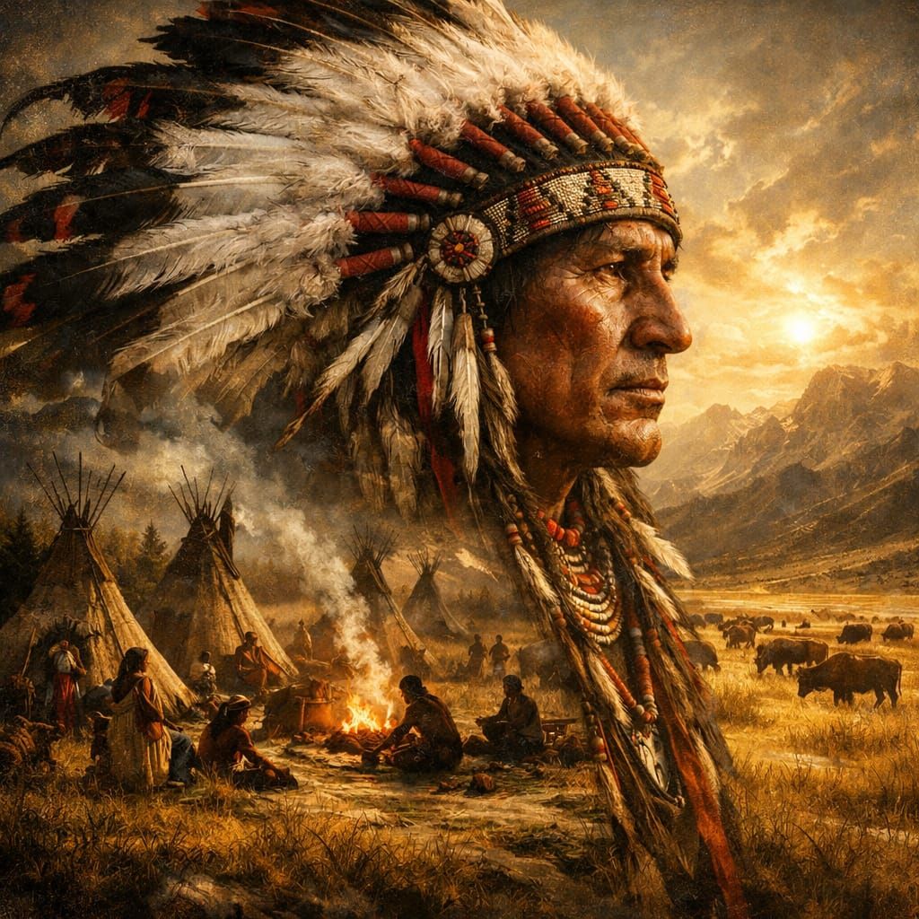 A double exposure image of a Native American chief superimposed on a vibrant scene of a village and buffalo herd. Rendered in a maximalist, dramatic digital matte painting style with earthy colors.