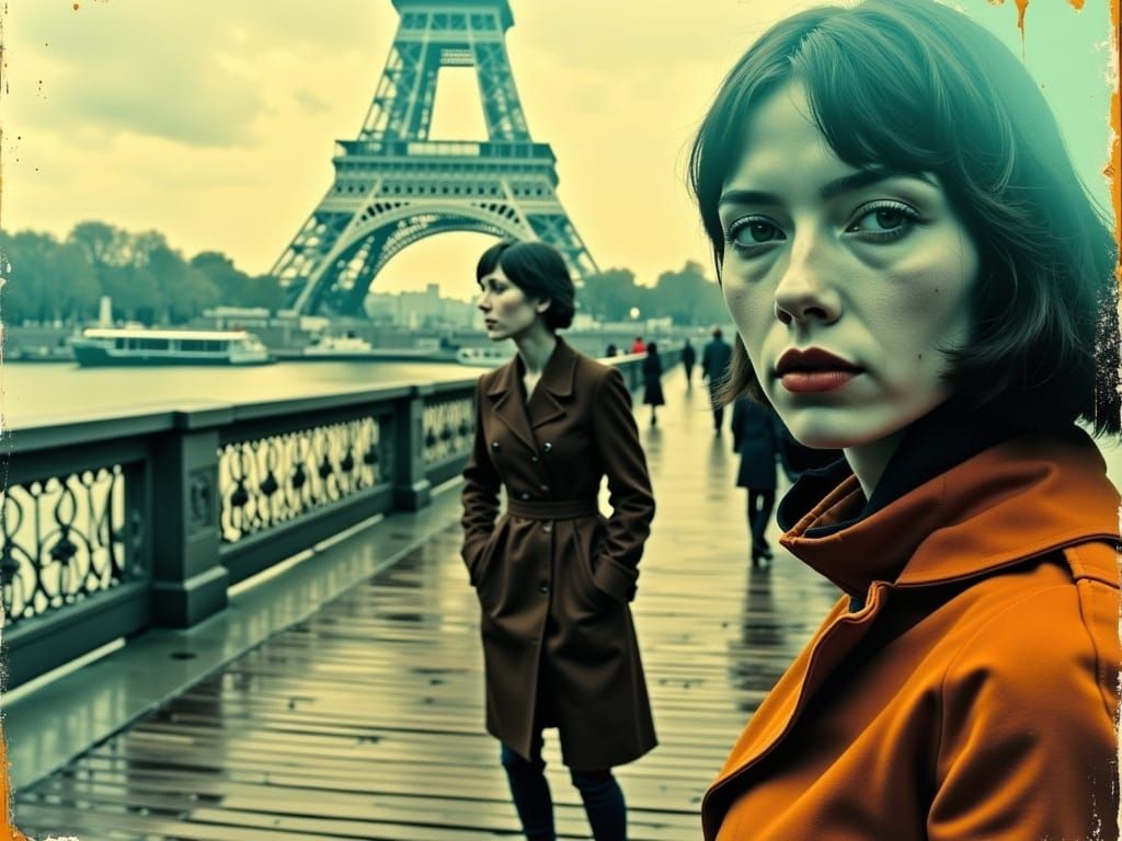This image shows a double exposure of two women in love on a Paris bridge superimposed over judgmental ex-girlfriend silhouettes, with selective amber and teal colors and bold contrast.