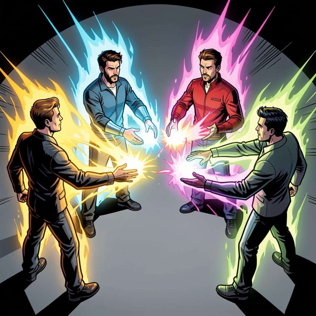 This image shows four people in a circle, directing vibrant energy auras towards each other. Rendered in a dynamic comic book art style with bold linework and dramatic lighting.