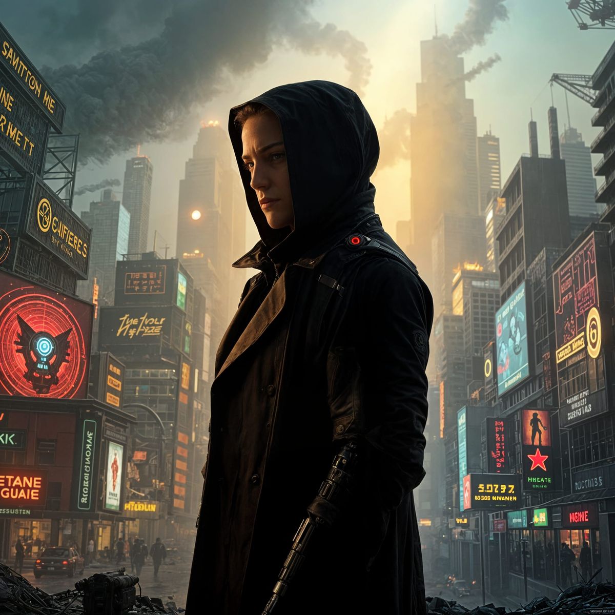 This striking image depicts a cybernetically enhanced mercenary standing strong amidst a dystopian cityscape, surrounded by toxic smoke and vibrant neon lights, with a cinematic quality reminiscent of classic sci-fi and fantasy art.
