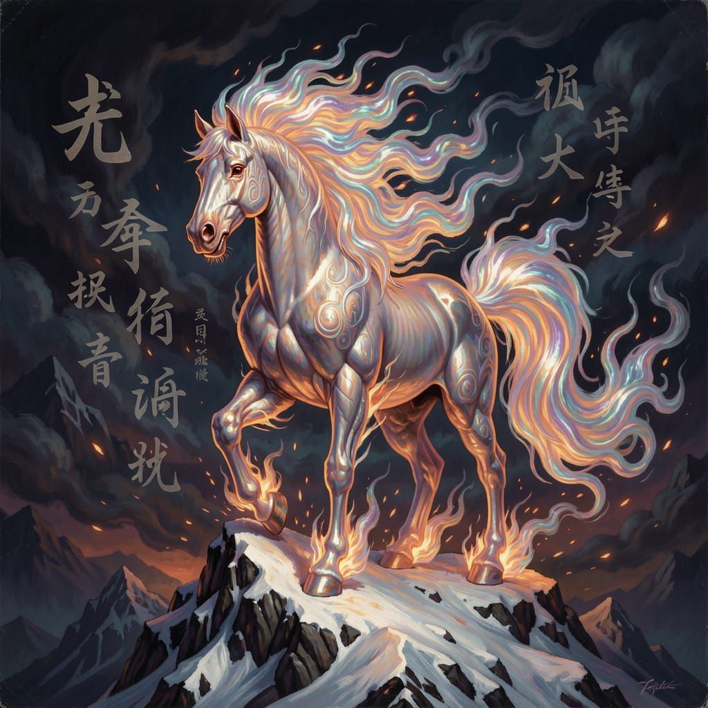 This image shows a majestic fire horse with flame mane and tail on a snowy mountain. Chinese calligraphy symbols are subtly integrated into the smoky, ember-filled atmosphere, presented in a dark, atmospheric gothic art style with dramatic lighting.