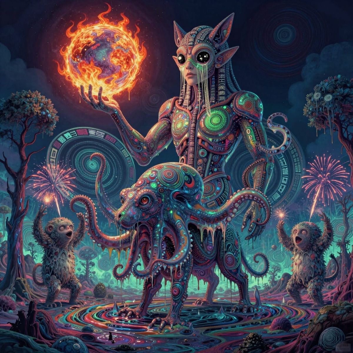 Color negatives, inverted colors, inverted shading, Creepy psychedelic diverse colorful cinematic abundance complex hyper-definition image in neon multicolor image of a oozing dripping melting octopus riding an oozing dripping melting greek sphinx both textured and patterned with spiraled spots floating ...