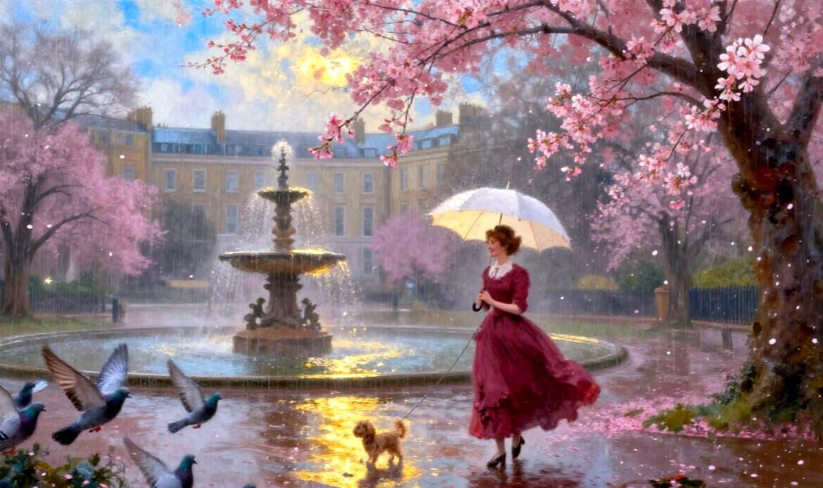 This image shows a dreamy, impressionist painting of a rainy park in Edwardian London. A lady with a carmine dress and white umbrella walks her dog through shimmering puddles and mist, with cherry blossoms swirling.