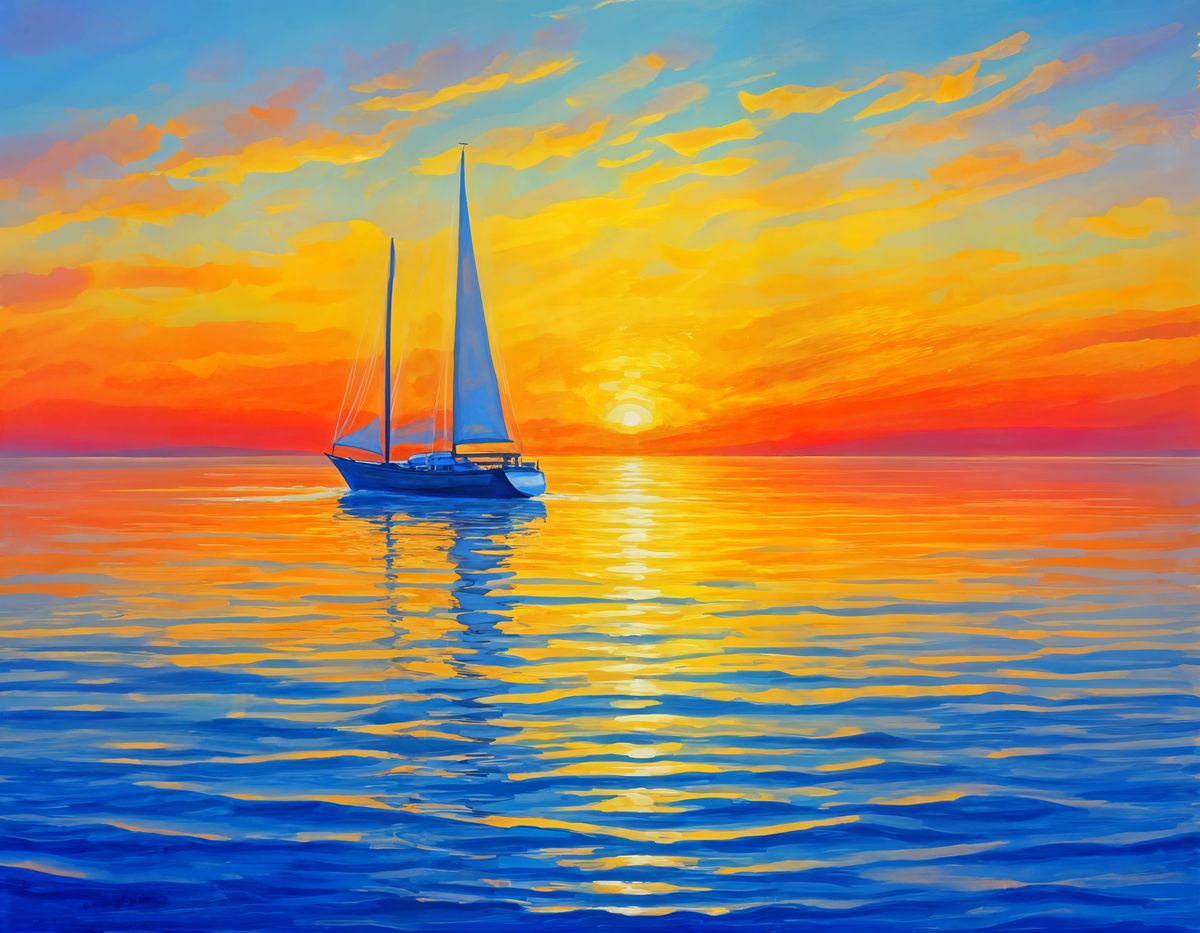 This image shows a vibrant impressionist painting of a sailboat on a calm ocean during sunset. Warm colors dominate the scene, with reflections in the water and sky.