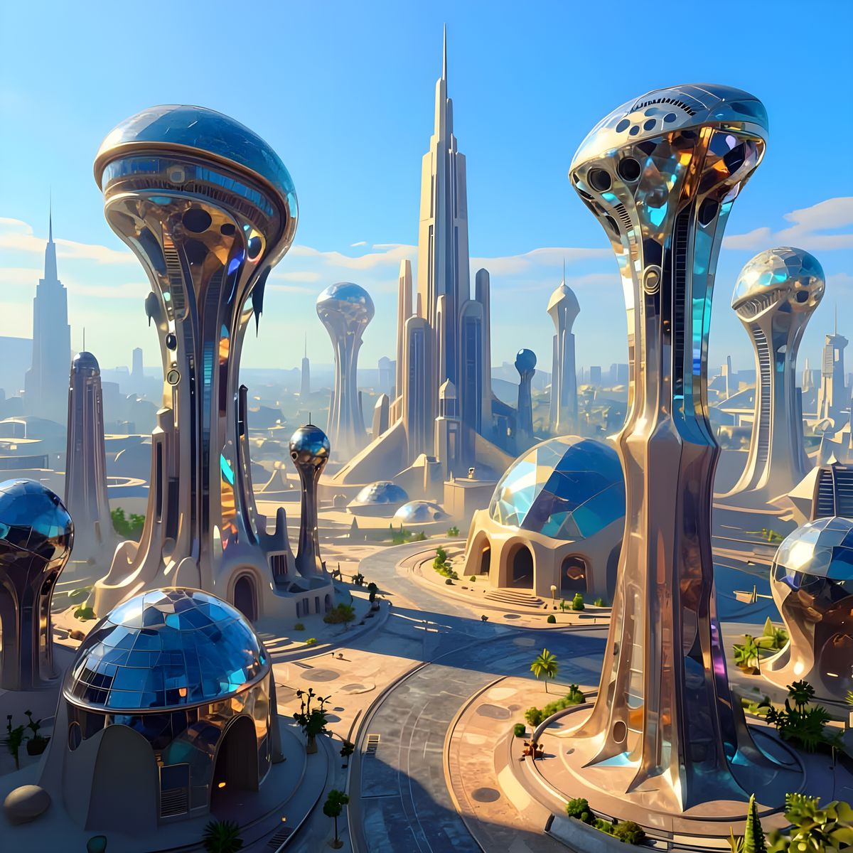 This image depicts a surreal futuristic alien city, blending the impossible architecture of M. C. Escher with the dreamlike elements of Dali's work, creating a thought-provoking visual.