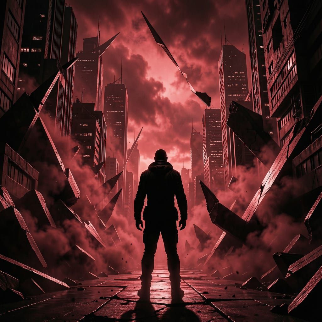 This image displays a lone figure in a dark, futuristic city with red and black smoke. Jagged shapes and high contrast create an intense, emotional atmosphere.