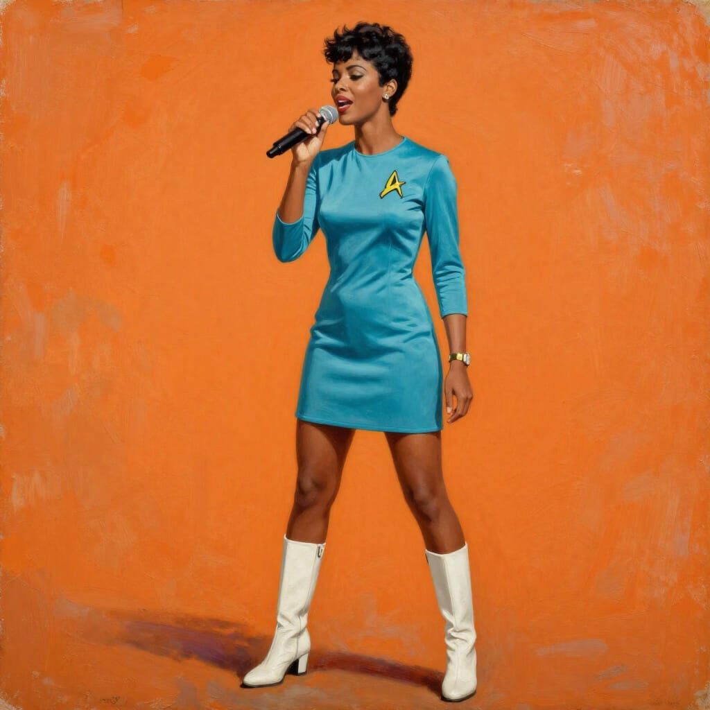 This image shows a stunning African American woman in a Star Trek mini-dress and go-go boots, singing against an orange background. Rendered in a hyperrealistic impressionist oil painting style.