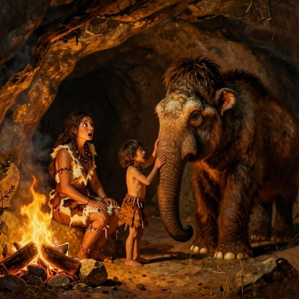 Stone Age woman dressed in animal skin, sitting in a cave, Sone Age child standing just inside cave with a large wooly mammoth as pet