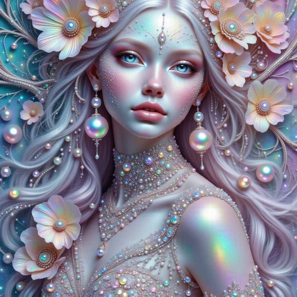 This image shows a pastel alien woman in a fantasia gown, decorated with pearls and jewels. Features luminous lighting and soft colors in a fantasy art style.