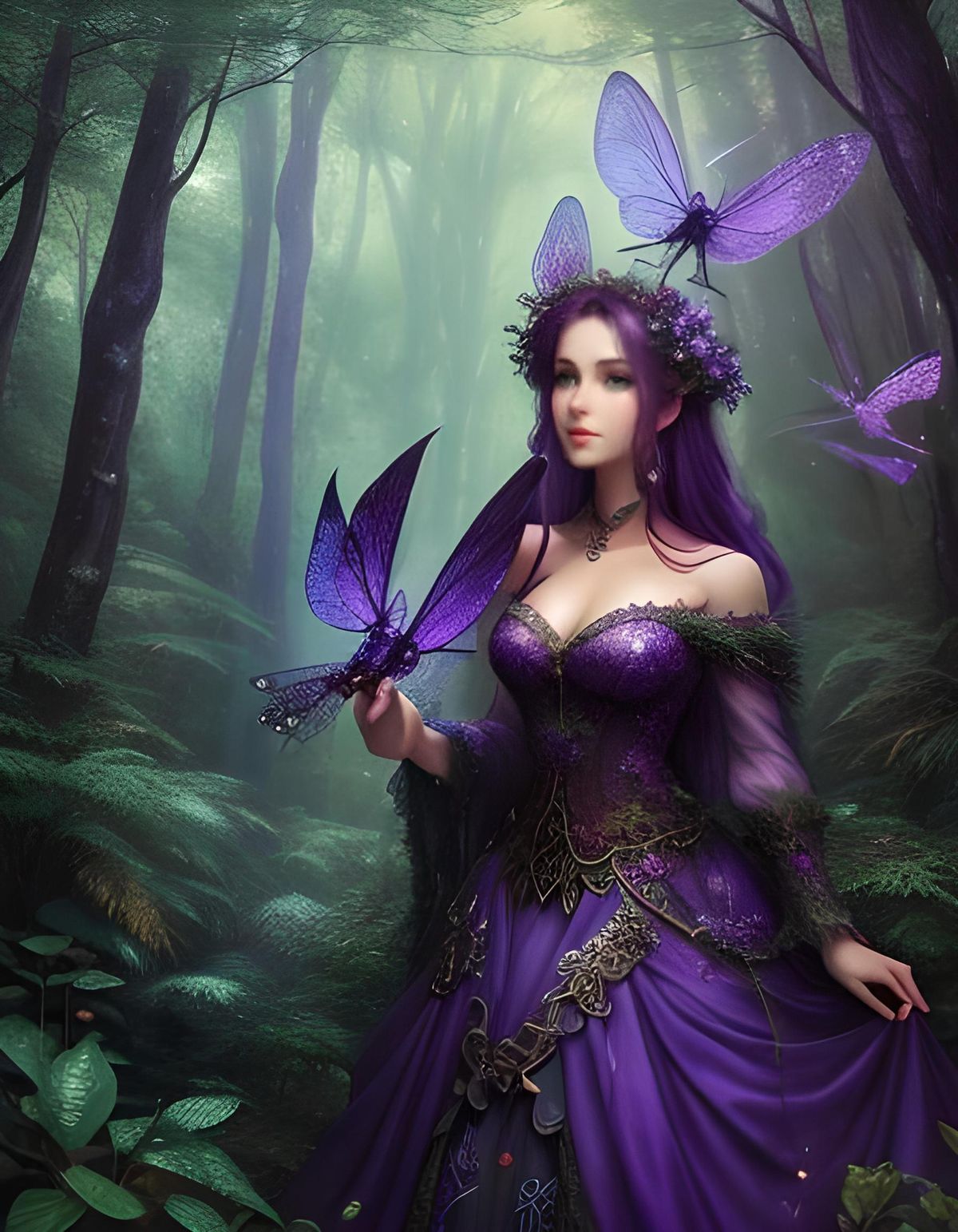 This image shows a woman in a forest with fantasy animals and dragonflies. The scene evokes a hyperdetailed ethereal fantasy art style with misty lighting.