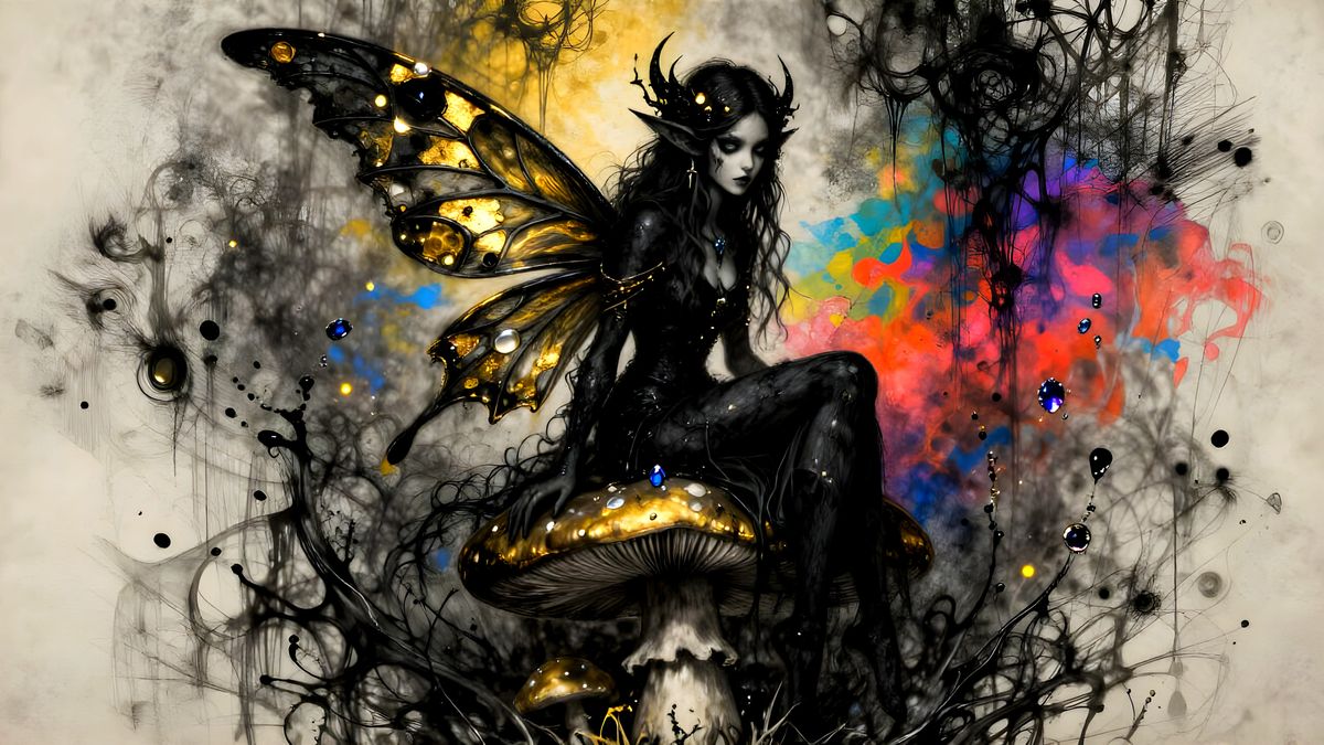 This hyperrealistic concept art features a dark faerie with human eyes, seated on a mushroom. The image showcases gothic black and gold tones with vibrant colors and intricate details.