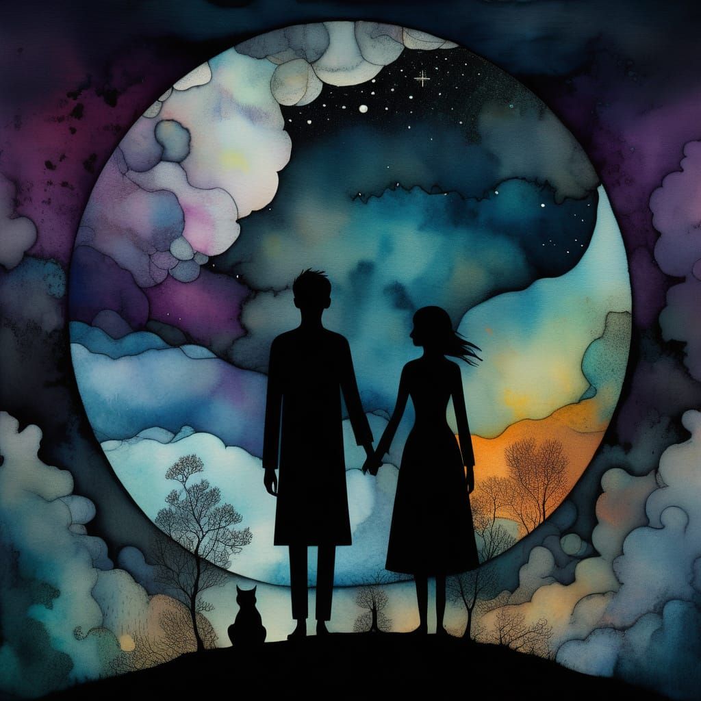 This watercolor painting shows two people holding hands, finding peace within the chaos of a world ending. Rendered in dark, muted colors with intricate detail.