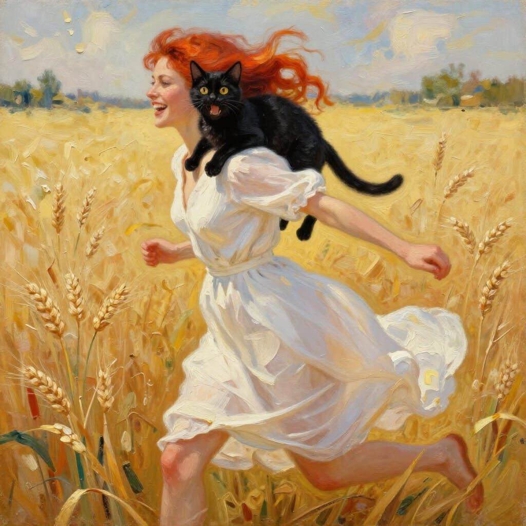 This image shows a woman in a white dress running through a wheat field with a happy cat on her shoulder. Rendered in a textured oil painting style with bold brushstrokes and warm light.