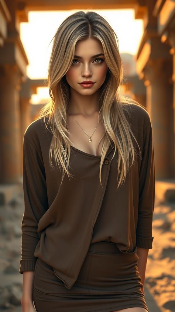 This hyperrealistic 3D CG image features a sweet maiden with blonde hair and a sly smirk, dressed in a loose top and pencil skirt. Set in desert ruins during golden hour, it uses cinematic lighting.