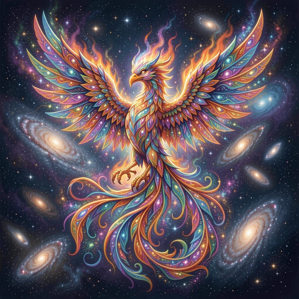 This image shows a majestic phoenix with holographic and cosmic elements. Rendered in vibrant colors with intricate details, it features ethereal flames and stardust wings against a cosmic void.