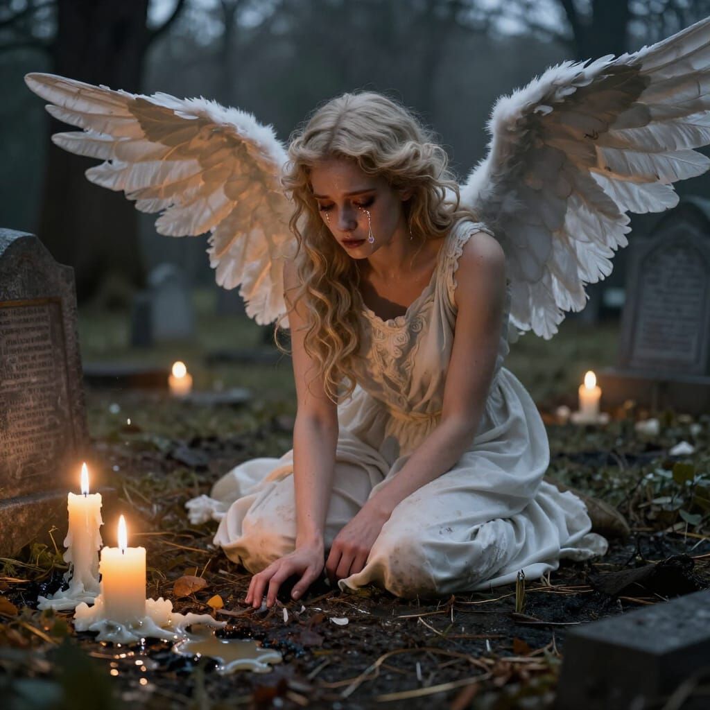 A hyperrealistic image of a fallen angel in a graveyard, with sorrowful eyes and a single tear. Ethereal glow from melted candles and cinematic lighting create an atmospheric mood.