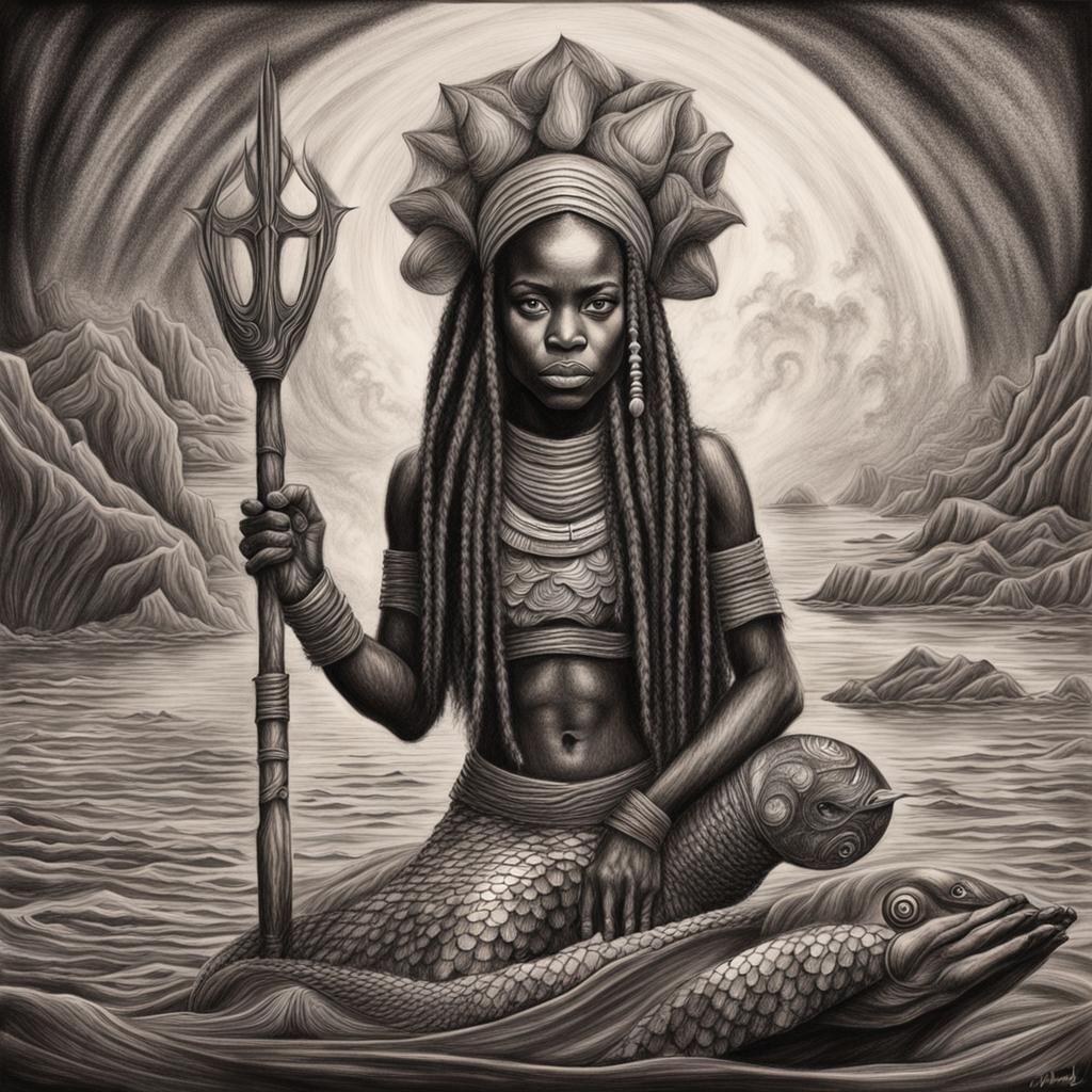 A hyperdetailed charcoal drawing of a mermaid with brown skin reimagined as a Jedi. The artwork captures intricate details and a unique blend of fantasy and science fiction elements.