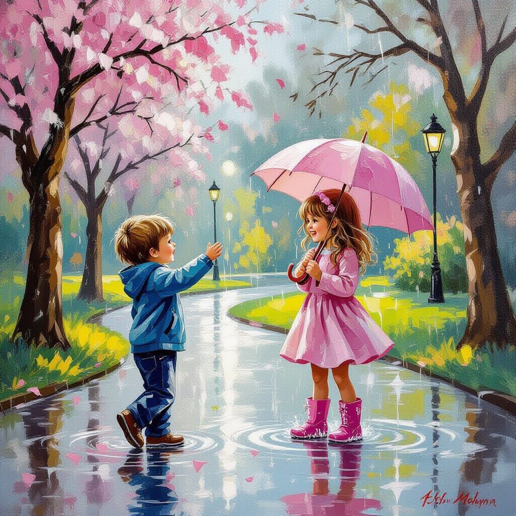 This image shows two children joyfully splashing in puddles during a spring rain shower in a park. Rendered in a realistic oil painting style.