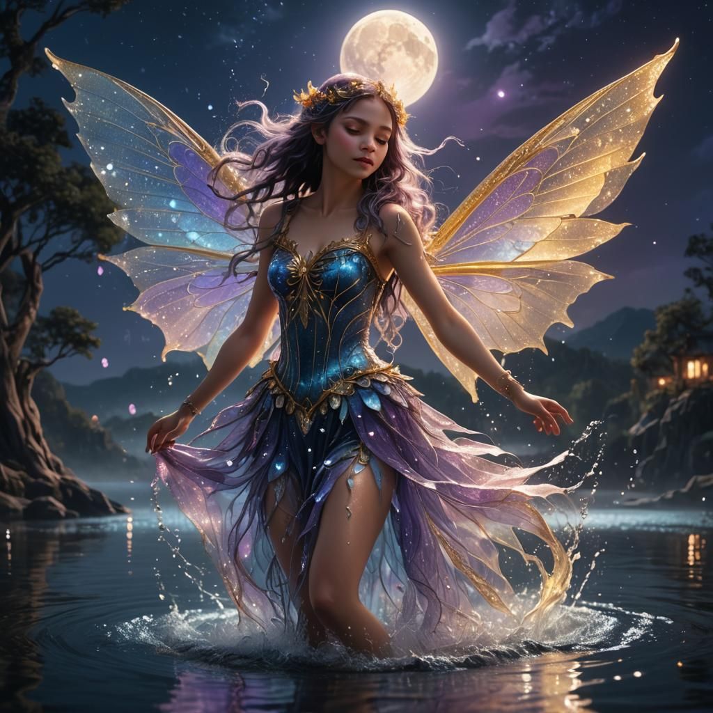 A mesmerizing image of a fairy dancing on the water in moonlight. This fantasy art features intricate details, sparkling water droplets, and iridescent wings with a dreamy, ethereal aesthetic.