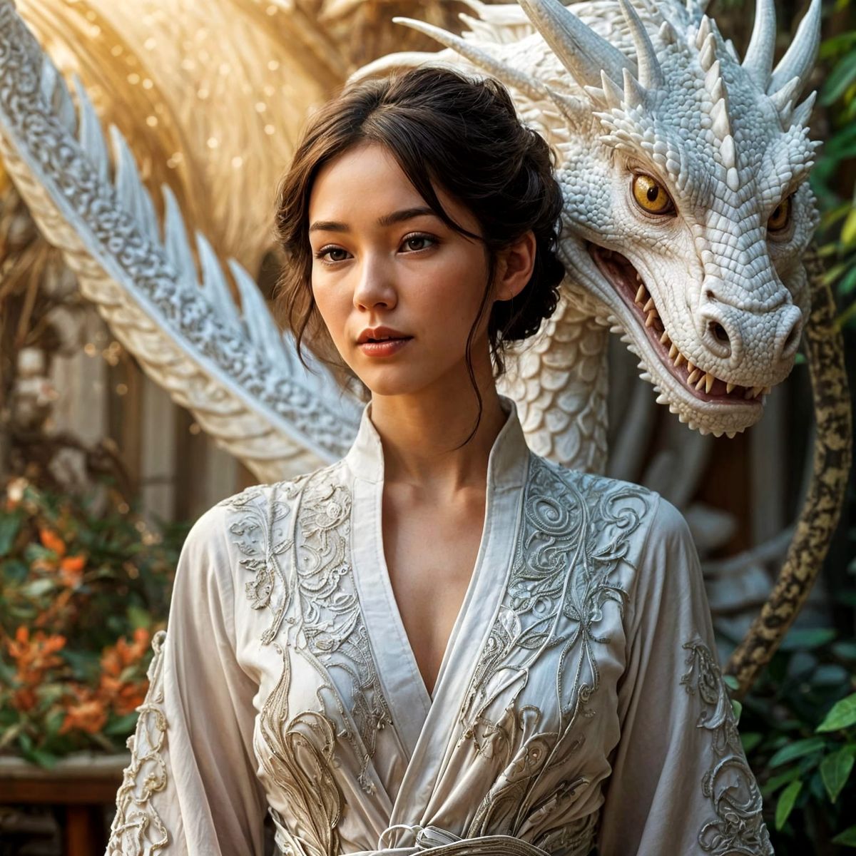 This enchanting illustration depicts a majestic white dragon, resembling a snake, embracing a beautiful harajuku-style woman in a fantastical atmosphere. With intricate lines, delicate textures, and a harmonious balance of earthy tones and bright colors, the artwork invites viewers to immerse themselves ...