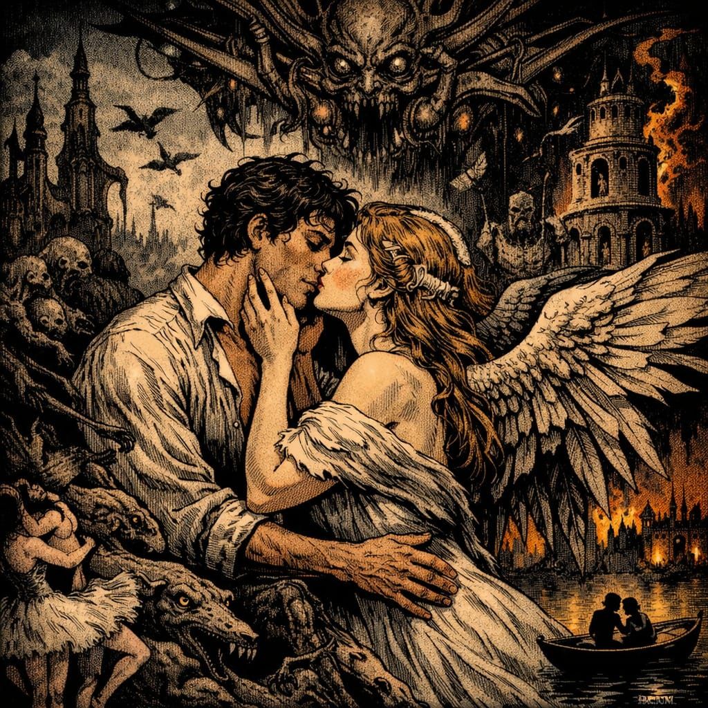 This image depicts a beautiful, romantic angel rendered in a graphic novel style, blending influences from various artistic masters. It's a striking visual interpretation.
