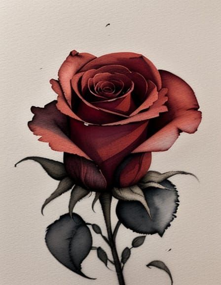 This image shows a single faded red rose on a white surface, rendered as a lithograph with charcoal aquarelle. It features delicate smudges and washes in sepia and muted crimson tones.